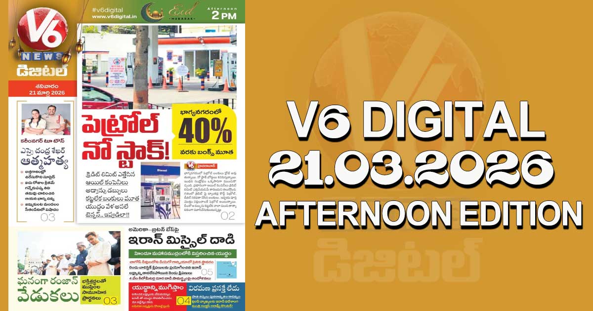 Reading Time: < 1 minute V6 DIGITAL 21.03.2026 AFTERNOON EDITION Caption of Image. పెట్రోల్ బంకుల్లో నో స్టాక్.. సిటీలో 40% బంక్స్ బంద్!! హిందూ మహాసముద్రం దాకాయుద్ధం..కీలక బేస్ పై ఇరాన్ క్షిపణి దాడి కరీంనగర్ టూటౌన్ ఎస్సై ఆత్మహత్య.. కారణం ఇదే! ఇంకా మరెన్నో.. క్లిక్ చేయండి Post navigation వాడి వయసెంత..చేసిన పనేంటీ.! పేరెంట్స్ మందలించారని.. పురుగులమందు తాగిన 8ఏళ్ల బాలుడు హైటెన్షన్ విద్యుత్ వైర్లు తగిలి.. టపాసుల లోడు లారీ కాలిబూడిదయ్యింది