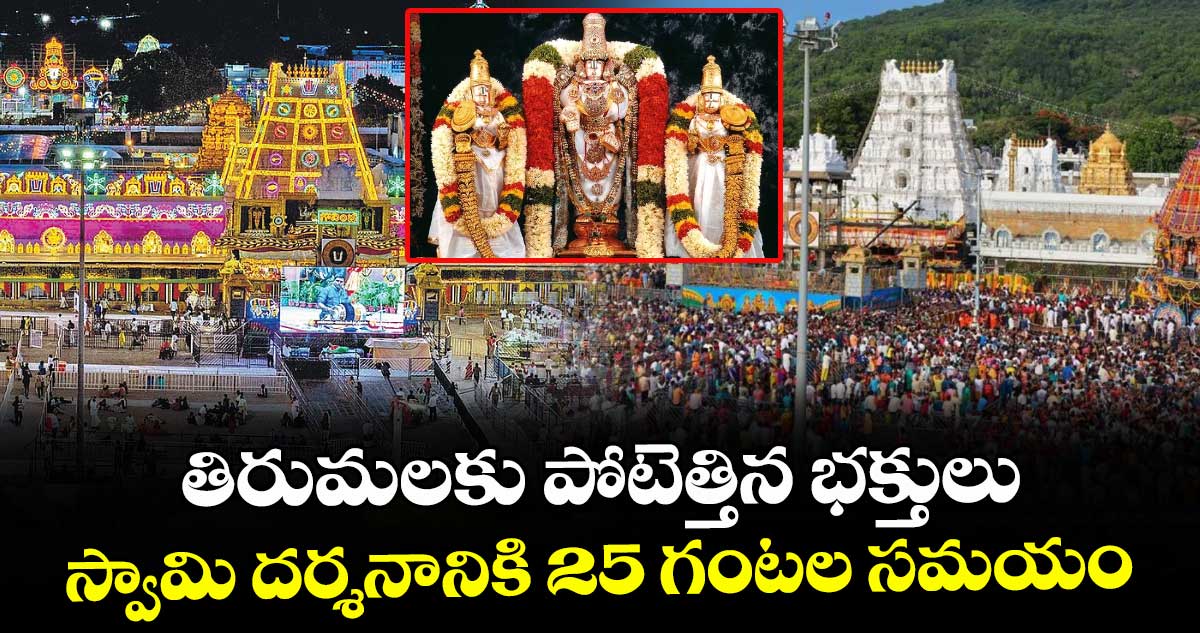 తిరుమల కొండకు భక్తులు పోటెత్తారు. భారీగా భక్తులు రావడంతో తిరుమల కిటకిటలాడుతోంది. ఉగాది, రంజాన్ పండుగలతో వరుసగా నాలుగు రోజులు సెలవులు రావడంతో తిరుమలకు భక్తులు క్యూ కట్డారు. వైకుంఠం క్యూ కాంప్లెక్స్ లోని అన్ని కంపార్ట్ మెంట్లు భక్తులతో నిండిపోయాయి. బయట బాట గంగమ్మ గుడి వరకు సుమారు 4 కిమీ మేర క్యూ లైన్లలో భక్తులు బారులు తీరి ఉన్నారు. దీంతో ఉచిత సర్వదర్శనానికి 25 గంటల సమయం పడుతోంది. టైమ్ స్లాట్ SSD దర్శనానికి 9 గంటల సమయం…. 300/- రూపాయల ప్రత్యేక ప్రవేశ దర్శనం భక్తులకు 6 గంటల సమయం పడుతుంది.