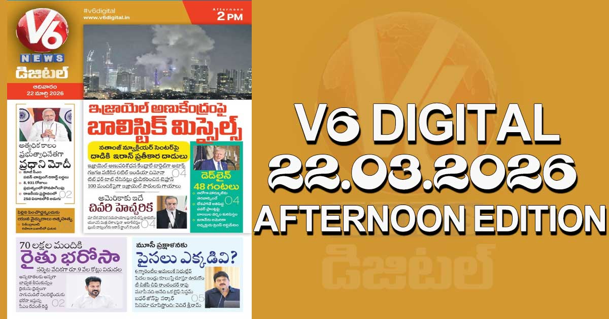 Reading Time: < 1 minute V6 DIGITAL 22.03.2026 AFTERNOON EDITION Caption of Image. ఇరాన్ బద్లా..వణికిన లిటిల్ ఇండియా రైతు భరోసాపై సీఎం ఏమన్నారంటే? మూసీ ప్రక్షాళనకు పైసలెక్కడివి అంటున్న బీజేపీ స్టేట్ చీఫ్ ఇంకా మరెన్నో.. క్లిక్ చేయండి Post navigation SRH: బ్యాటింగ్లో అదుర్స్.. బౌలింగ్లో బెదుర్స్.. SRHపై CSK మాజీ ప్లేయర్ హాట్ కామెంట్స్ SRH Practice Match: ప్రాక్టీస్ మ్యాచ్లోనే 282 రన్స్.. మరోసారి దుమ్మురేపేందుకు సిద్ధమైన ఎస్ఆర్హెచ్