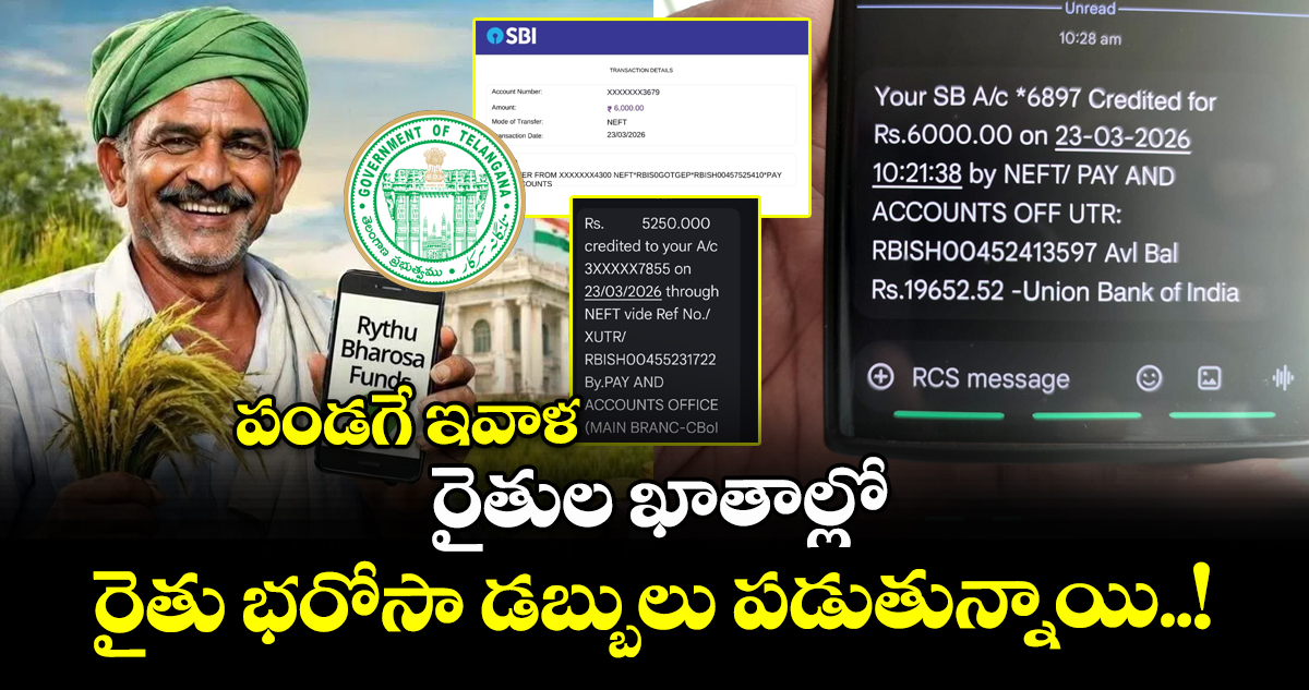 2026, మార్చి 23వ తేదీ ఉదయం 11 గంటల నుంచి తెలంగాణ రాష్ట్ర వ్యాప్తంగా రైతుల బ్యాంక్ అకౌంట్లలో డబ్బులు పడుతూ ఉన్నాయి. ఈ మేరకు రైతులు తమ ఖాతాల్లో పడిన రైతు భరోసా డబ్బులను స్క్రీన్ షాట్స్ తీసి సోషల్ మీడియాలో పోస్ట్ చేస్తున్నారు.