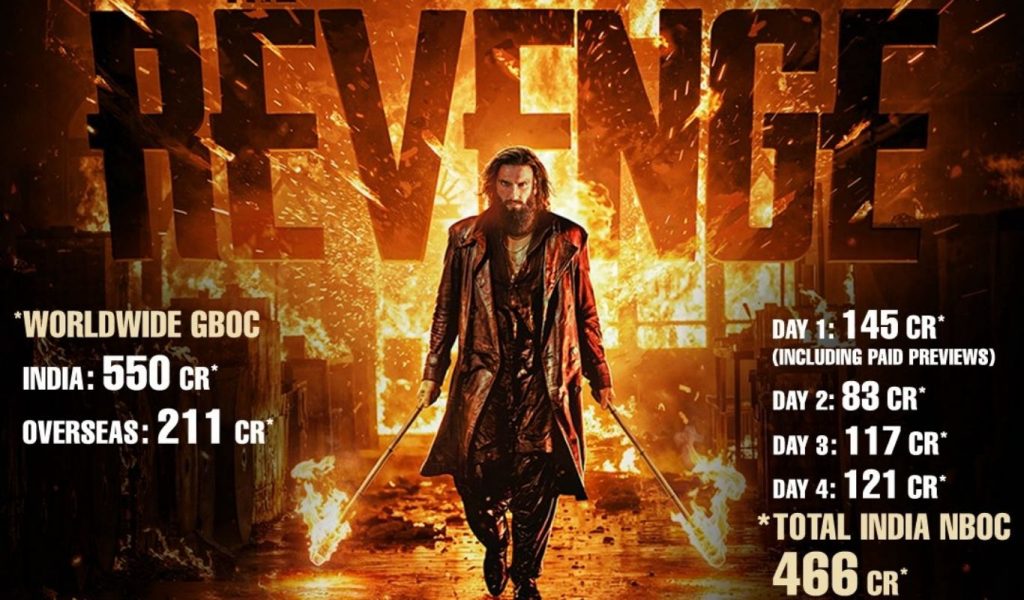 కాగా ఈ సినిమా నాలుగు రోజుల కలెక్షన్స్ ను అధికారకంగా ప్రకటించింది జియో స్టూడియోస్. భారతదేశ వ్యాప్తంగా ఈ చిత్రం మొదటి రోజు ఏకంగా రూ. 145 కోట్లతో భారీ ఓపెనింగ్స్ సాధించింది. ఇక రెండో రోజు రూ. 83 కోట్లు కొల్లగొట్టగా మూడో రోజు వీకెండ్ అడ్వాంటేజ్ తో రూ. 117 కోట్లు కలెక్ట్ చేసింది. ఆదివారం నాలుగో రోజు రూ. 121 కోట్లు వసూలు చేసి సెన్సేషన్ క్రియేట్ చేసింది. దీంతో కేవలం ఇండియాలోనే మొత్తం రూ. 466 కోట్ల నెట్ కలెక్షన్లను తన ఖాతాలో వేసుకుంది. వర్కింగ్ డేస్లో కూడా కలెక్షన్స్ నిలకడగా ఉండటం ఈ సినిమా బాక్సాఫీస్ స్టామినాను నిరూపిస్తోంది. అటు ఓవర్సీస్ మార్కెట్లో కూడా ‘ధురందర్’ ప్రభంజనం కొనసాగుతోంది. విదేశాల్లో ఇప్పటివరకు రూ. 211 కోట్ల వసూళ్లను సాధించింది. మొత్తంగా చూసుకుంటే, ఈ చిత్రం నాలుగు రోజుల్లో ప్రపంచవ్యాప్తంగా రూ. 761 కోట్ల గ్రాస్ కలెక్షన్లను సాధించి వెయ్యి కోట్ల క్లబ్లోకి చేరే దిశగా వేగంగా అడుగులు వేస్తోంది. 2026లో ఇప్పటివరకు వచ్చిన చిత్రాల్లో ఇదే అత్యధిక వసూళ్లు సాధించిన చిత్రంగా రికార్డు సృష్టించింది. రూ. 550 కోట్లు ఇండియన్ మార్కెట్ నుండి రాబట్టిందంటే ధురంధర్ క్రేజ్ ఎలా ఉందొ అర్ధం చేసుకోవచ్చు. లాంగ్ రన్ లో ఈ సినిమా రూ. 2000 మార్క్ ను టచ్ చేస్తుందని ట్రేడ్ అంచనా వేస్తుంది.