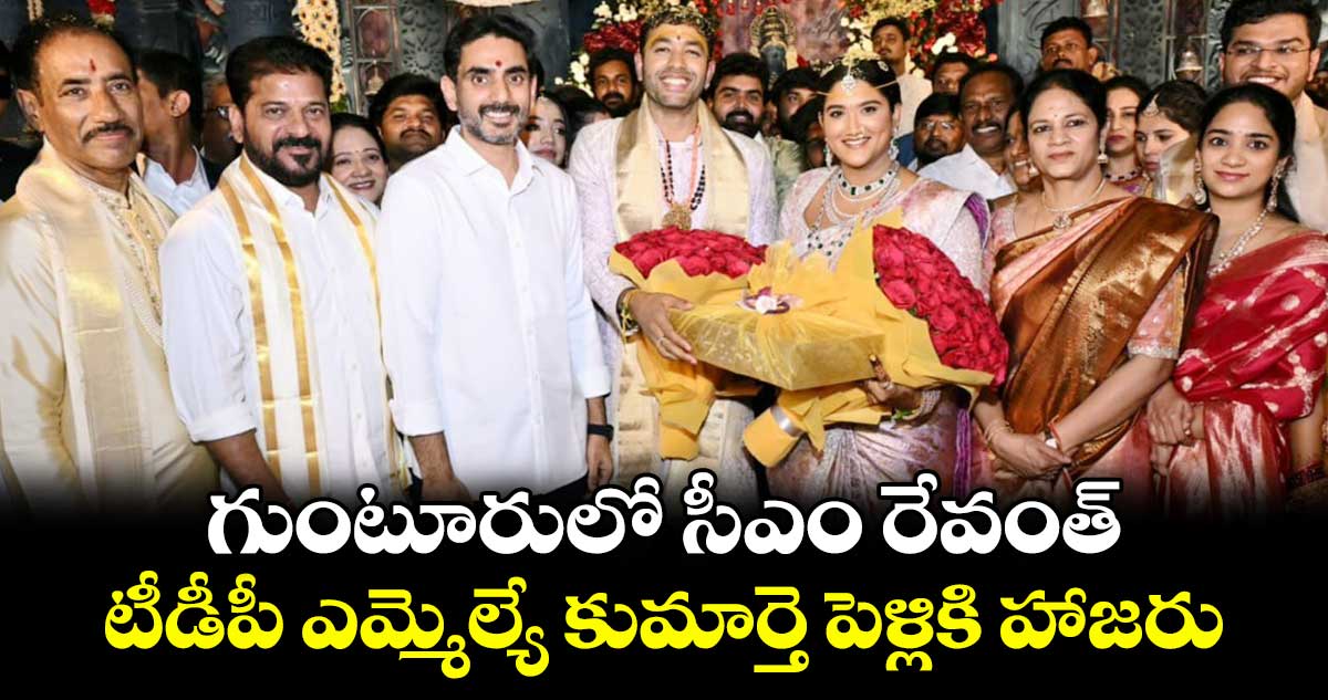 గుంటూరు: పొన్నూరు టీడీపీ ఎమ్మెల్యే ధూళిపాళ్ల నరేంద్ర కుమార్తె వివాహానికి తెలంగాణ సీఎం రేవంత్ రెడ్డి హాజరై వధూవరులను ఆశీర్వదించారు. కుటుంబ సమేతంగా తెలంగాణ సీఎం ఈ పెళ్లికి వెళ్లారు.