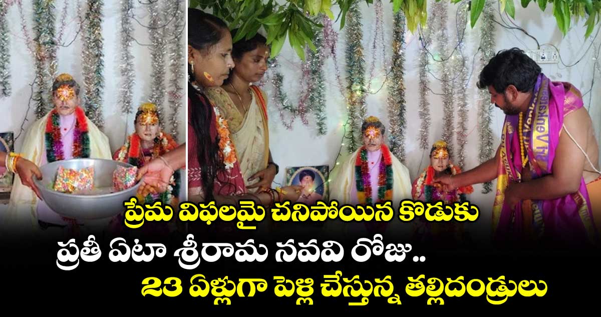 శ్రీరామనవమి రోజు.. అందరూ రాములోరి కళ్యాణంలో ఉండగా.. ఆ తల్లిదండ్రులు మాత్రం తమ రాముడు.. తమ కొడుకు పెళ్లి చేస్తూ భావోద్వేగానికి గురయ్యారు. భౌతికంగా లేకపోయినా విగ్రహాలను ఏర్పాటు చేసి.. అతడు ప్రేమించిన అమ్మాయితో పెళ్లి చేసి వారి తీరని కోరికను తీర్చారు. గత 23 ఏళ్లుగా చనిపోయిన కొడుకుకు పెళ్లి జరుపుతున్నారు ఆ తల్లిదండ్రులు. మహబూబాబాద్ జిల్లాలో శుక్రవారం (మార్చి 27) జరిగిన ఈ పెళ్లి వేడుక అందరి హృదయాలను కరిగించి వేసింది.