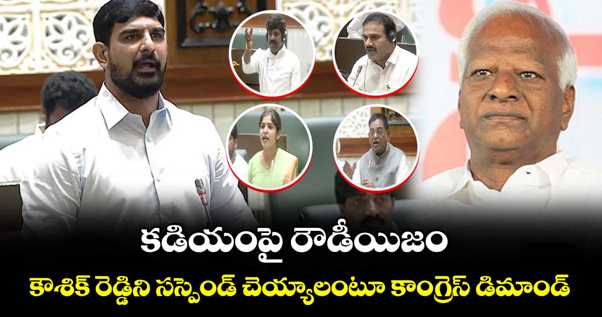 తెలంగాణ అసెంబ్లీలో బీఆర్ఎస్ ఎమ్మెల్యే పాడి కౌశిక్ రెడ్డి అనుచిత ప్రవర్తన వివాదాస్పదంగా మారింది. ఎమ్మెల్యే కడియం శ్రీహరిని తుపాకీతో కాల్చి చంపుతానని పాడి కౌశిక్ రెడ్డి బెదిరించడం కరెక్ట్ కాదంటూ కాంగ్రెస్ ఆగ్రహం వ్యక్తం చేసింది. ఎమ్మెల్యే పాడి కౌశిక్ రెడ్డిని సస్పెండ్ చేయాలని మండిపడింది. కౌశిక్ రెడ్డిపై చర్యలు తీసుకోవాలని కాంగ్రెస్ డిమాండ్ చేసింది.