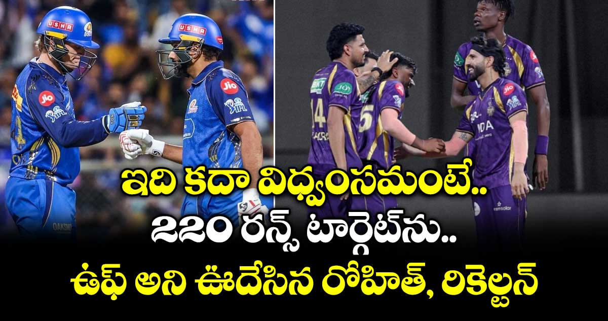 221 పరుగుల లక్ష్య ఛేదనకు దిగిన ముంబై ఇండియన్స్ జట్టు దంచికొట్టింది. ఒకవైపు రోహిత్ శర్మ, మరోవైపు ర్యాన్ రికెల్టన్ కొట్టే కొట్టుడికి కేకేఆర్ బౌలర్లు వికెట్లు తీయకపోగా పరుగులు ఇవ్వకుండా ఆపేందుకు తెగ ప్రయత్నం చేశారు.. కానీ ఫలితం మాత్రం దక్కలేదు. ఎట్టకేలకు రోహిత్– రికెల్టన్ మధ్య 148 పరుగులు భాగస్వామ్యాన్ని వైభవ్ ఆరోరా బ్రేక్ చేశాడు. వైభన్ వేసిన బాల్ ని భారీ షాట్ ఆడబోయిన హిట్ మ్యాన్ అనుకూల్ రాయ్ కి క్యాచ్ ఇచ్చి పెవిలియన్ కి వెళ్లిపోయాడు.
