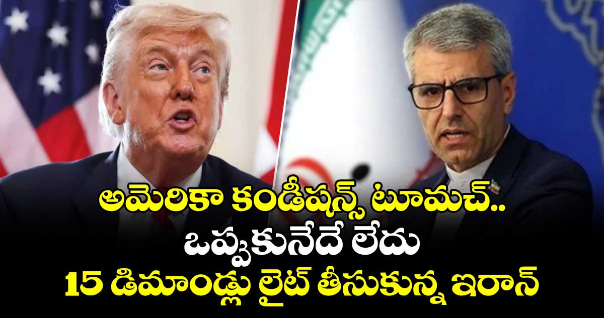 టెహ్రాన్: యుద్ధం ముగించేందుకు అమెరికా ప్రతిపాదించిన 15 డిమాండ్ల శాంతి ప్రణాళికను ఇరాన్ తిరస్కరించింది. అమెరికా కండీషన్స్ టూమచ్గా ఉన్నాయని.. ఒప్పుకునే సమస్యే లేదని ఖరాకండిగా చెప్పింది ఇరాన్. అమెరికా ప్రతిపాదనలు అవాస్తవికమైనవి, అసమంజసమైనవి అని అభివర్ణించింది ఇరాన్. ఈ మేరకు ఇరాన్ విదేశాంగ మంత్రిత్వ శాఖ ప్రతినిధి ఇస్మాయిల్ బఘాయీ మాట్లాడుతూ.. యుద్ధం ముగించడానికి అమెరికా అధ్యక్షుడు ట్రంప్ ప్రతిపాదించిన15 షరతులు అతిగా ఉన్నాయని పేర్కొన్నారు. ఇరాన్ వాటికి ఎన్నటికీ ఒప్పుకోదని తేల్చిచెప్పారు. యుద్ధం ముగింపు కోసం ఇప్పటి వరకు అమెరికా, ఇరాన్ మధ్య ఇప్పటి వరకు ఎలాంటి ప్రత్యక్ష చర్చలు జరగలేదని తెలిపారు.