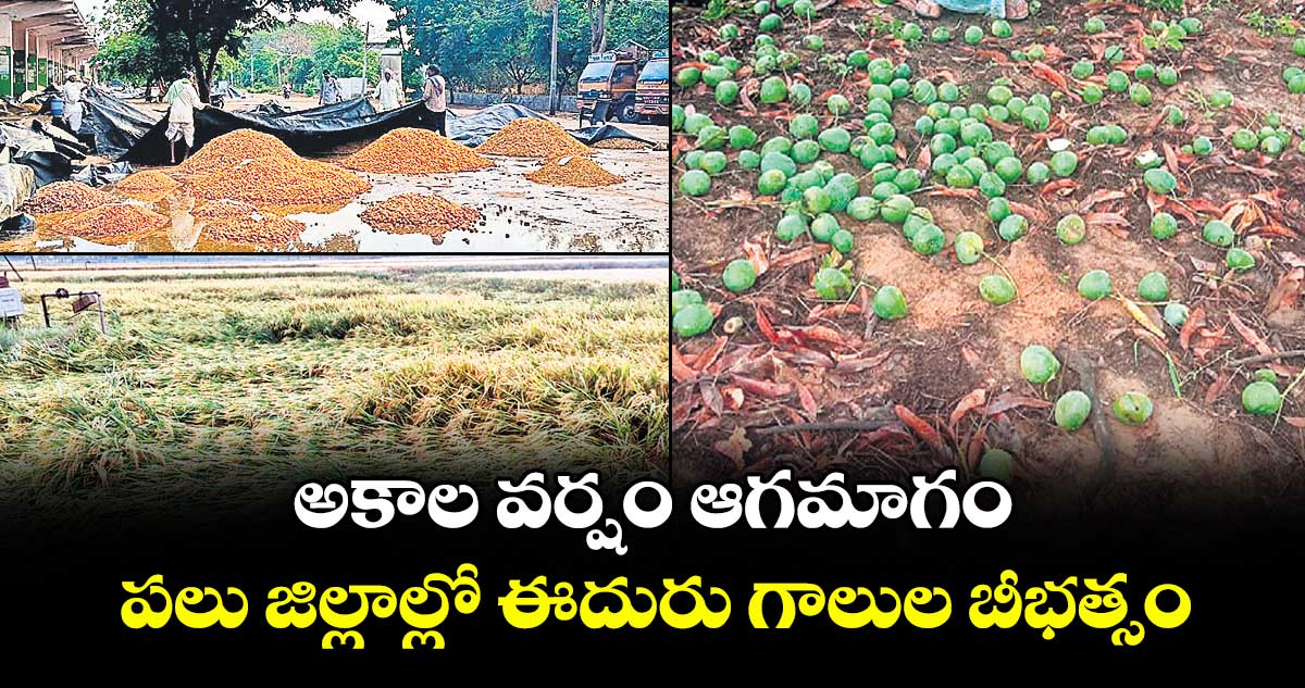 అకాల వర్షం రాష్ట్రంలో రైతులను ఆగమాగం చేసింది. వానకు ఈదురుగాలులు తోడవడంతో కోతకొచ్చిన వరితో పాటు మొక్కజొన్న, జొన్న పంటలు నేలకొరిగాయి.. మామిడికాయలు రాలిపోయాయి. సోమవారం రాత్రి, మంగళవారం ఉదయం రాష్ట్రంలోని పలు ప్రాంతాల్లో కురిసిన వర్షానికి పంటలు దెబ్బతిన్నాయి. జనగామ, భూపాలపల్లి, నిజామాబాద్, నిర్మల్, కామారెడ్డి, మంచిర్యాల, జగిత్యాల జిల్లాల్లోని మార్కెట్లలో ధాన్యం తడిసిపోయింది. జనగామలో వరద ధాటికి మార్కెట్లో ఉన్న మక్కలు కొట్టుకుపోయాయి.