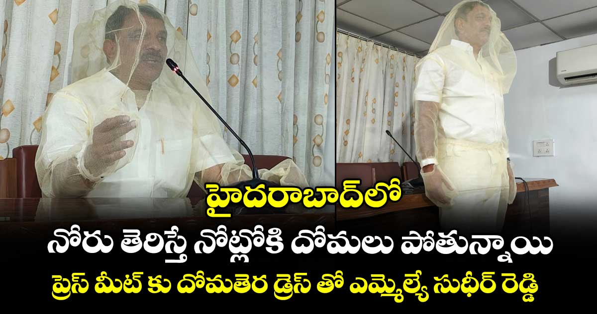 హైదరాబాద్ లో జనాన్ని పట్టిపీడిస్తున్న ప్రధాన సమస్యల్లో దోమల బెడద ఒకటని ప్రత్యేకంగా చెప్పాల్సిన పనిలేదు. ఇళ్ళు, రోడ్లు, గ్రౌండ్లు అనే తేడా లేకుండా ఎక్కడ చూసినా దోమలు విపరీతంగా ఉంటున్నాయి. హైదరాబాద్ లో దోమల బెడదపై సోషల్ మీడియాలో కూడా పెద్ద ఎత్తున చర్చ జరుగుతోంది. ఈ క్రమంలో బీఆర్ఎస్ ఎమ్మెల్యే దేవిరెడ్డి సుధీర్ రెడ్డి దోమల బెడదపై వినూత్న రీతిలో నిరసన తెలిపారు. గురువారం ( ఏప్రిల్ 2 ) అసెంబ్లీ మీడియా హాల్ లో దోమతెరతో కుట్టిన డ్రెస్ తో ప్రెస్ మీట్ కి హాజరయ్యారు ఎమ్మెల్యే సుధీర్ రెడ్డి. ఈ సందర్భంగా మాట్లాడుతూ.. హైదరాబాద్ లో నోరు తెరిస్తే నోట్లోకి దోమలు పోతున్నాయని అన్నారు సుధీర్ రెడ్డి.