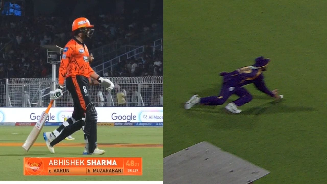 సన్రైజర్స్ ఇన్నింగ్స్ తొమ్మిదో ఓవర్లో ఈ సంఘటన చోటుచేసుకుంది. బ్లెస్సింగ్ ముజారబానీ వేసిన షార్ట్ పిచ్ బంతిని అభిషేక్ శర్మ భారీ షాట్ ఆడాడు. డీప్ స్క్వేర్ లెగ్ దిశగా వెళ్తున్న ఆ బంతిని వరుణ్ చక్రవర్తి ముందుకు డైవ్ చేస్తూ అద్భుతంగా అందుకున్నాడు. అయితే బంతి నేలకు తగిలినట్లు అనుమానం రావడంతో ఫీల్డ్ అంపైర్లు నిర్ణయాన్ని థర్డ్ అంపైర్కు నివేదించారు. రీప్లేలో బంతి నేలను తాకి పైకి లేచినట్లు కనిపిస్తున్నప్పటికీ, అంపైర్ మాత్రం అది క్లీన్ క్యాచ్ అని భావించి అవుట్గా ప్రకటించాడు.