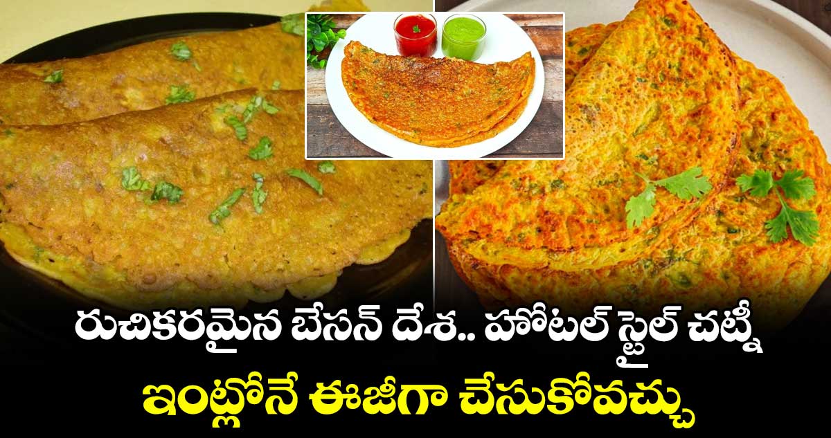 దోశ కోసం సిద్ధం చేసుకొన్న పదార్థాలన్నీ మెత్తగా గ్రైండ్ చేయాలి. ఈ పిండిని రాత్రంతా పక్కన పెట్టాలి. తర్వాత రోజు స్టవ్ మీద పాన్ పెట్టి పిండిని పల్చటి దోశలా వేయాలి. రెండు వైపులా దోరగా కాలే వరకు కొద్దిగా నెయ్యి వేయాలి. మసాలా కోసం రెడీ చేసుకొన్న పదార్థాలన్నీ దోశ మీద ఒక పొరలా .. పరచాలి, లేదంటే మధ్యలో పెట్టి దోశను మడతపెట్టుకుంటే సరిపోతుంది. చట్నీ కోసం రెడీ చేసుకున్న పదార్థాలను మిక్సీలో వేసి మెత్తగా పేస్ట్ చేయాలి… ఈ చట్నీతో బేసన్ దేశ రుచిగా బాగుంటుంది.