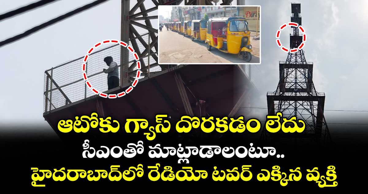 ఆటోకు గ్యాస్ దొరకడం లేదంటూ ఓ వ్యక్తి రేడియో టవర్ ఎక్కిన ఘటన హైదరాబాద్ లో కలకలం రేపింది. టవర్ ఎక్కడమే కాకుండా 100 నెంబర్ కు డయల్ చేసి సమాచారం ఇచ్చాడు. కిందికి దించే ప్రయత్నం చేసిన పోలీసులకు.. సీఎంతో మాట్లాడేదాక కిందికి దిగేదే లేదని కండిషన్ పెట్టడంతో పరిస్థితి గందరగోళంగా మారింది.