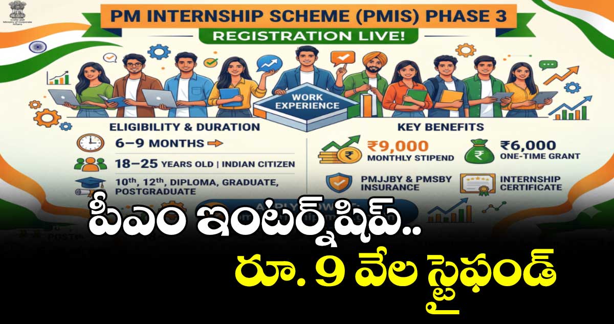 డిగ్రీ, పీజీ చివరి సంవత్సరం చదువుతున్న వారు, దూరవిద్య విద్యార్థులు కూడా దరఖాస్తు చేసుకోవచ్చని, కుటుంబ వార్షికాదాయం రూ. 12 లక్షల లోపు ఉండాలని సూచించారు. ఆరు నుంచి తొమ్మిది నెలల కాలపరిమితి ఉండే ఈ ఇంటర్న్షిప్లో నెలకు రూ. 9,000 స్టైఫండ్ అందజేస్తామని తెలిపారు. ఆసక్తి గల అభ్యర్థులు pminternship.mca.gov.in వైబ్సైట్ను చూడాలని, సహాయం కోసం 1800 11 6090 టోల్ ఫ్రీ నంబర్ను సంప్రదించాలని ఆయన కోరారు.