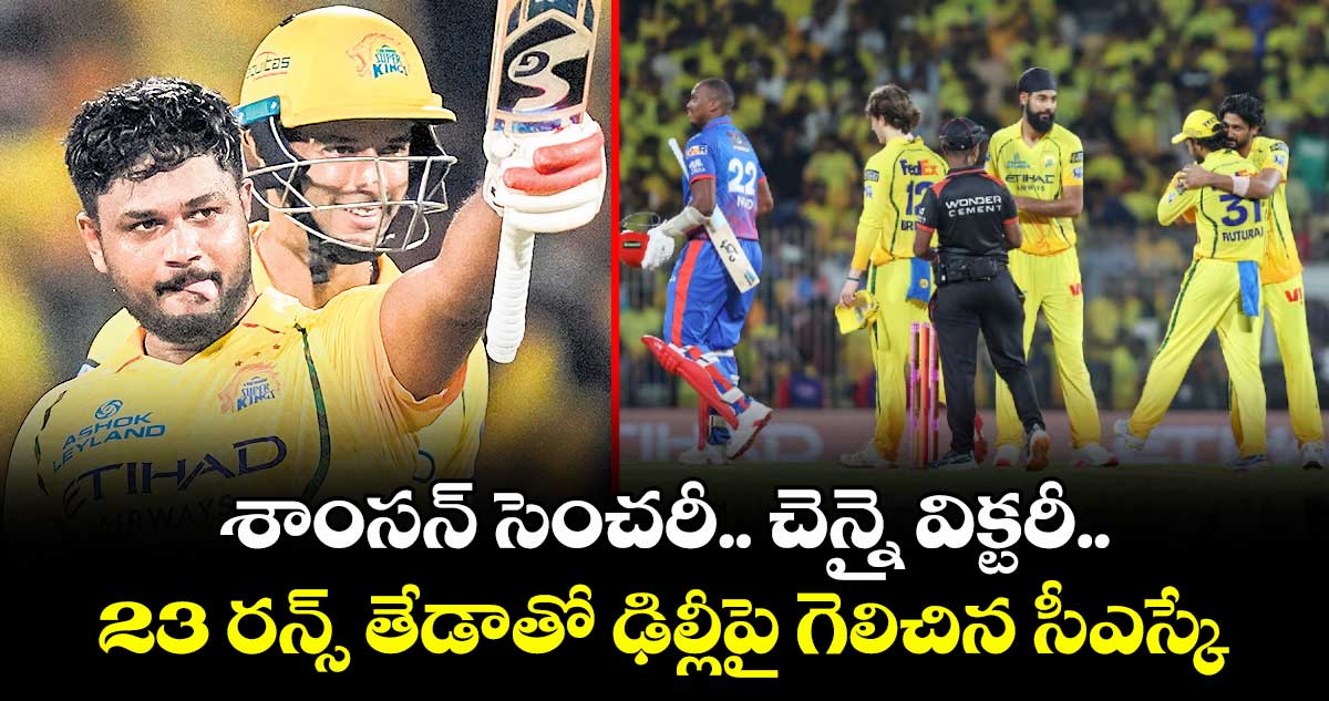 చెన్నై: టీ20 వరల్డ్ కప్ హీరో సంజూ శాంసన్ (56 బాల్స్లో 15 ఫోర్లు, 4 సిక్సర్లతో 115 నాటౌట్) ఫామ్లోకి వచ్చి సూపర్ సెంచరీతో కదం తొక్కడంతో ఐపీఎల్లో మూడు పరాజయాల తర్వాత చెన్నై సూపర్ కింగ్స్ ఎట్టకేలకు గెలుపు రుచి చూసింది. శనివారం రాత్రి జరిగిన మ్యాచ్లో 23 రన్స్ తేడాతో ఢిల్లీ క్యాపిటల్స్ను ఓడించింది. శాంసన్ విధ్వంసకర సెంచరీకి తోడు యంగ్ బ్యాటర్ ఆయుష్ మాత్రే ( 36 బాల్స్లో 3 ఫోర్లు, 4 సిక్సర్లతో 53) ఫిఫ్టీతో మెరవడంతో సీఎస్కే నిర్ణీత 20 ఓవర్లలో 212/2 స్కోరు చేసింది. అనంతరం ఢిల్లీ 20 ఓవర్లలో 189 రన్స్కు ఆలౌటైంది.