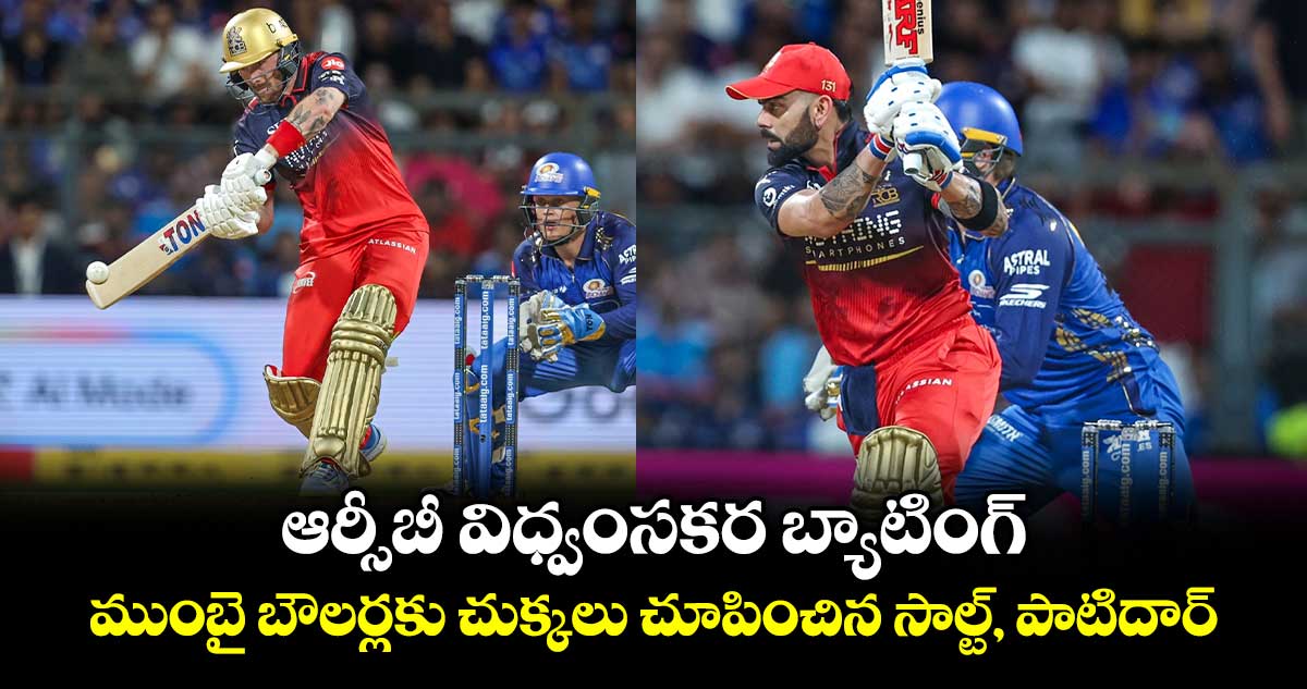 టాస్ ఓడి బ్యాటింగ్కు దిగిన ఆర్సీబీకి ఓపెనర్లు కళ్లు చెదిరే ఆరంభాన్ని ఇచ్చారు. ఫిల్ సాల్ట్ (36 బంతుల్లో 6 ఫోర్లు, 6 సిక్సులతో 78 పరుగులు) తొలి బంతి నుంచే ముంబై బౌలర్లపై విరుచుకుపడ్డాడు. మరోవైపు విరాట్ కోహ్లీ (38 బంతుల్లో 5 ఫోర్లు, ఒక సిక్సుతో 50 పరుగులు) క్లాస్ ఇన్నింగ్స్తో ఆకట్టుకున్నాడు. వీరిద్దరూ కలిసి మొదటి వికెట్కు 120 పరుగులు జోడించి స్ట్రాంగ్ పునాది వేశారు. హాఫ్ సెంచరీ తర్వాత సాల్ట్ అవుట్ అవ్వగా, కోహ్లీ కూడా అర్థ సెంచరీ పూర్తి చేసుకున్న వెంటనే హార్దిక్ పాండ్యా బౌలింగ్లో అవుటయ్యాడు.