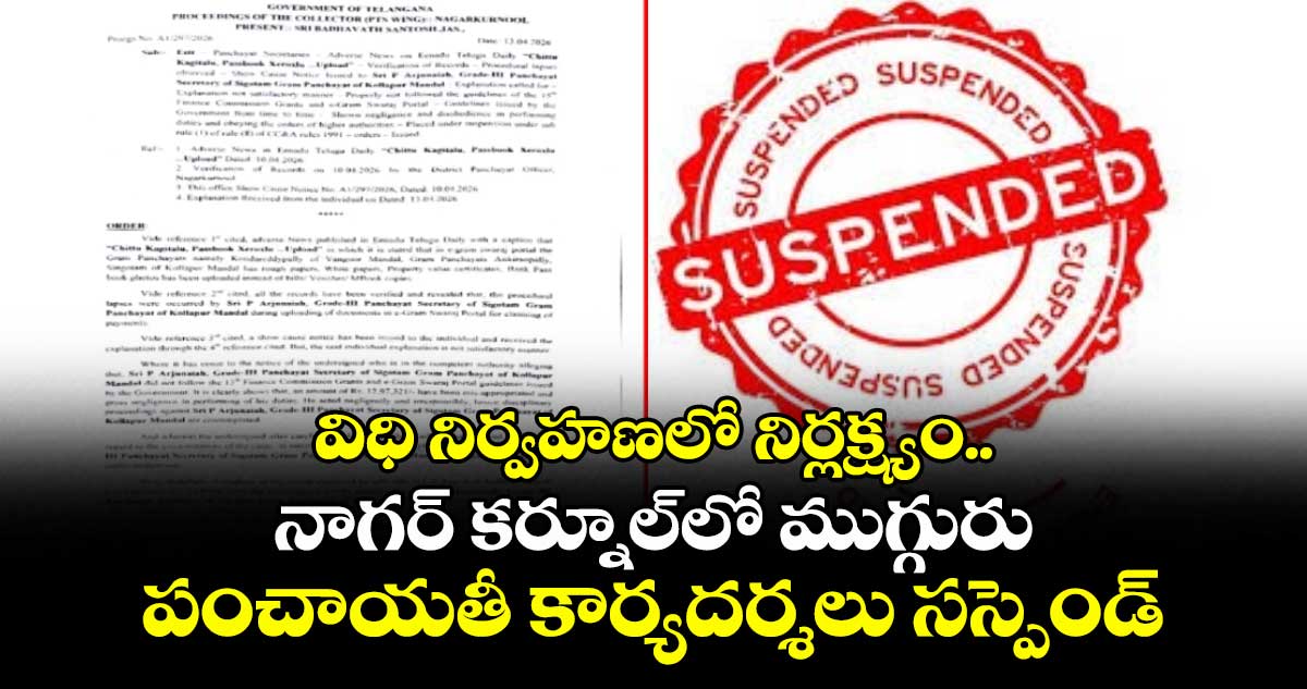 నాగర్ కర్నూల్: విధి నిర్వహణలో నిర్లక్ష్యంగా వ్యవహరించిన ముగ్గురు పంచాయతీ కార్యదర్శులపై నాగర్ కర్నూల్ జిల్లా కలెక్టర్ బాదావత్ సంతోష్ సస్పెన్షన్ వేటు వేశారు. వంగూరు మండలం కొండారెడ్డిపల్లి గ్రేడ్-IV కార్యదర్శి పి. కిషన్, కొల్లాపూర్ మండలం సింగోటం గ్రేడ్-III కార్యదర్శి పి. అర్జునయ్య, కొల్లాపూర్ మండలం అంకిరావుపల్లి గ్రేడ్-III కార్యదర్శి ఆర్. ప్రేమచంద్లు సస్పెన్షన్కు గురయ్యారు. అలాగే, పనుల పర్యవేక్షణలో నిర్లక్ష్యం వహించిన వంగూరు, కొల్లాపూర్ మండలాల పంచాయతీ అధికారులకు షోకాస్ నోటీసులు జారీ చేశారు. విధుల పట్ల ఏ మాత్రం అలసత్వం వహించిన ఉపేక్షించమని అధికారులు హెచ్చరించారు.