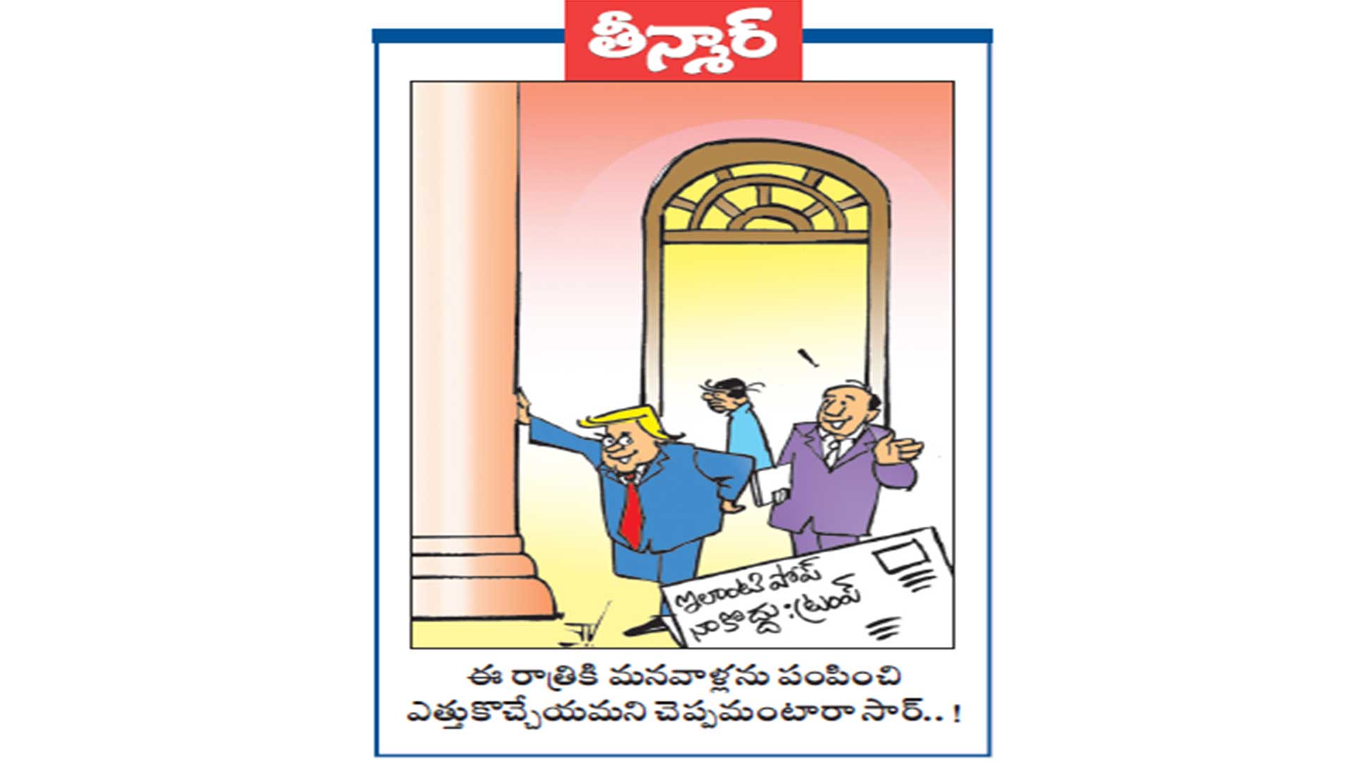 Reading Time: < 1 minute వెలుగు కార్టూన్ :ఈ రాత్రికి మనవాళ్లను పంపించి ఎత్తుకొచ్చేయమని చెప్పమంటారా సార్..! Caption of Image. ఇలాంటి పోప్ నాకొద్దు:ట్రంప్ Post navigation రిఫ్లెక్టివ్ స్టిక్కర్లు ఉంటేనే వాహనాలకు ఫిట్నెస్ సర్టిఫికెట్ కేసీఆర్ ముందు జీవన్ రెడ్డి చేతులు కట్టుకోవడం బాధాకరం : సీఎం రేవంత్
