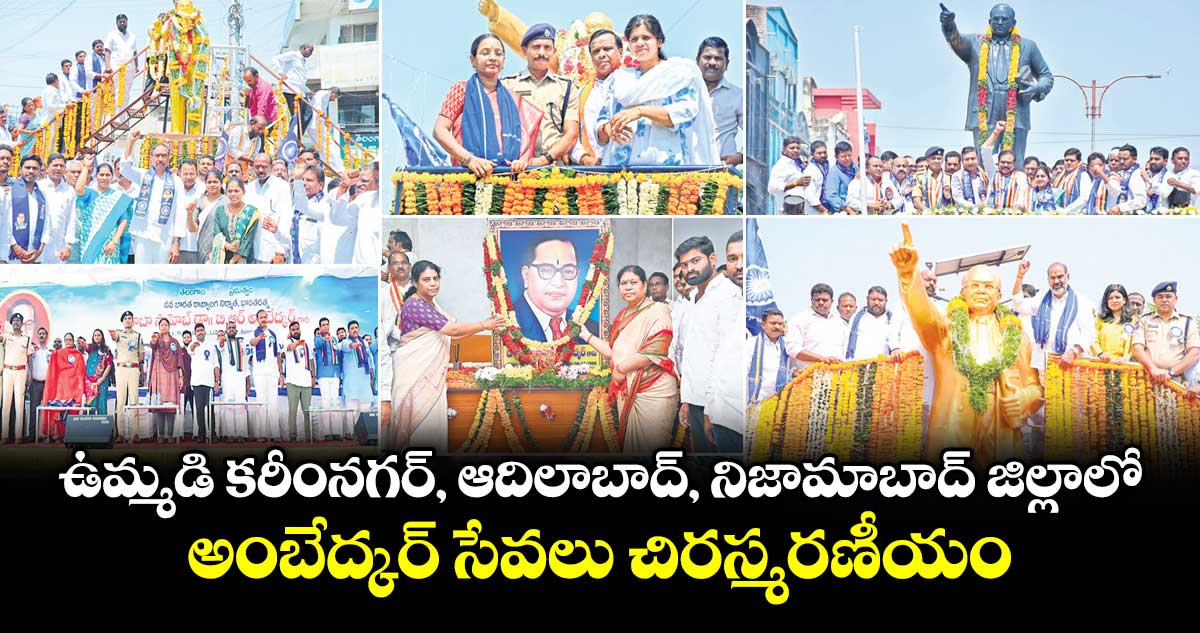 భారత రాజ్యంగ నిర్మాత డాక్టర్ బీఆర్ అంబేద్కర్ జయంతిని ఉమ్మడి కరీంనగర్, ఆదిలాబాద్, నిజామాబాద్ జిల్లాలో ప్రజలు ఘనంగా జరుపుకొన్నారు. కలెక్టరేట్లలో కలెక్టర్లు, అధికారులు, పార్టీ కార్యాలయాలు, పట్టణాల్లోని అంబేద్కర్ విగ్రహాల వద్ద ప్రజాప్రతినిధులు, నేతలు నివాళులు అర్పించారు.