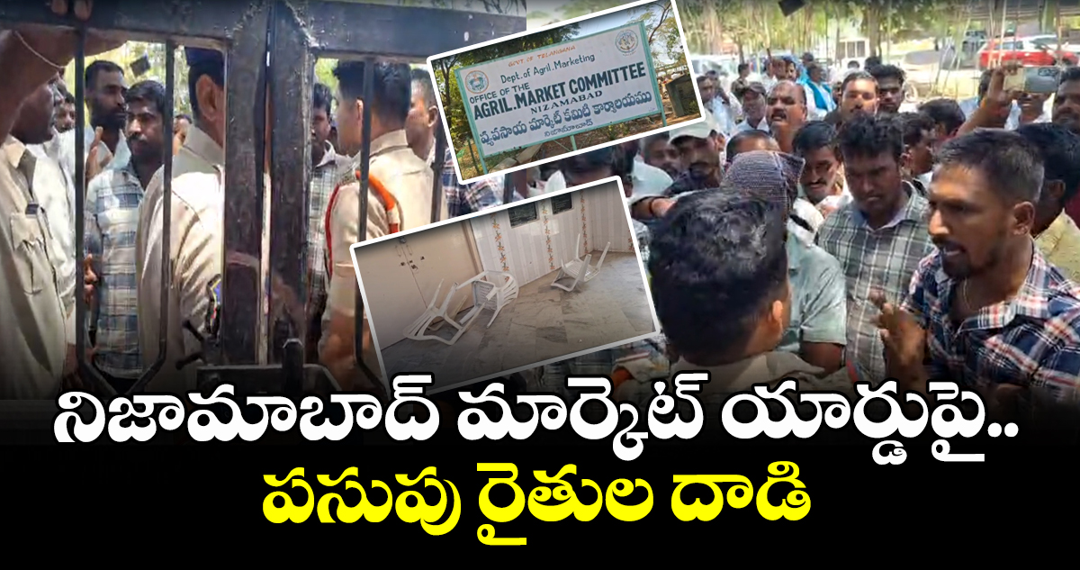 నిజామాబాద్ మార్కెట్ యార్డుపై పసుపు రైతులు దాడికి దిగారు. బహిరంగ వేలం ద్వారా కొనుగోలు చేస్తూ పసుపు ధర తగ్గిస్తున్నారని రైతులు ఆగ్రహం వ్యక్తం చేశారు. ఆన్ లైన్ లో ఒక ధర ఉంటే.. ఆఫ్ లైన్ ధర తగ్గించి కొనుగోలు చేస్తున్నారని ఆరోపించారు. మార్కెట్ అధికారుల తీరుపై మండిపడ్డ రైతులు.. ఆఫీస్ పై దాడి చేశారు. మార్కెట్ అధికారులను ఘెరావ్ చేశారు. కుర్చీలు, అద్దాలు ధ్వంసం చేశారు. మార్కెట్ లో బహిరంగవేలం ద్వారా జరుగుతున్న కొనుగోళ్లను వెంటనే నిలిపివేయాలని డిమాండ్ చేశారు. వివరాల్లోకి వెళితే..