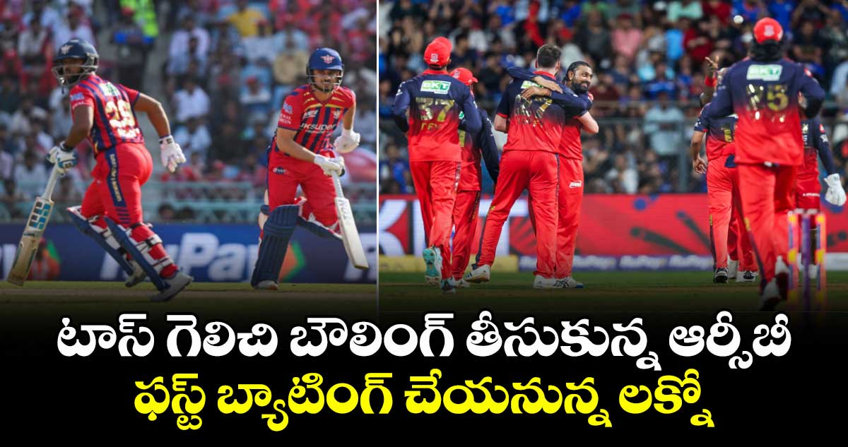 IPL 2026: ఇండియన్ ప్రీమియర్ లీగ్ (ఐపీఎల్ )2026లో భాగంగా బెంగళూరులోని చిన్నస్వామి స్టేడియంలో లక్నో సూపర్ జెయింట్స్ తో జరుగుతున్న కీలక పోరులో రాయల్ ఛాలెంజర్స్ బెంగళూరు జట్టు టాస్ గెలిచి బౌలింగ్ తీసుకుంది. దీంతో లక్నో మొదట బ్యాటింగ్ చేసేందుకు రెడీ అవుతుంది. ఈ మ్యాచులో భారీ స్కోర్ సాధించి ఆర్సీబీపై ఒత్తిడి పెట్టాలనే లక్ష్యంతో ముందుకు సాగుతుంది. కానీ లక్నో బ్యాటర్లని తొందరగా ఔట్ చేసి పట్టుసాధించాలని బెంగళూరు టార్గెట్ పెట్టుకుంది.