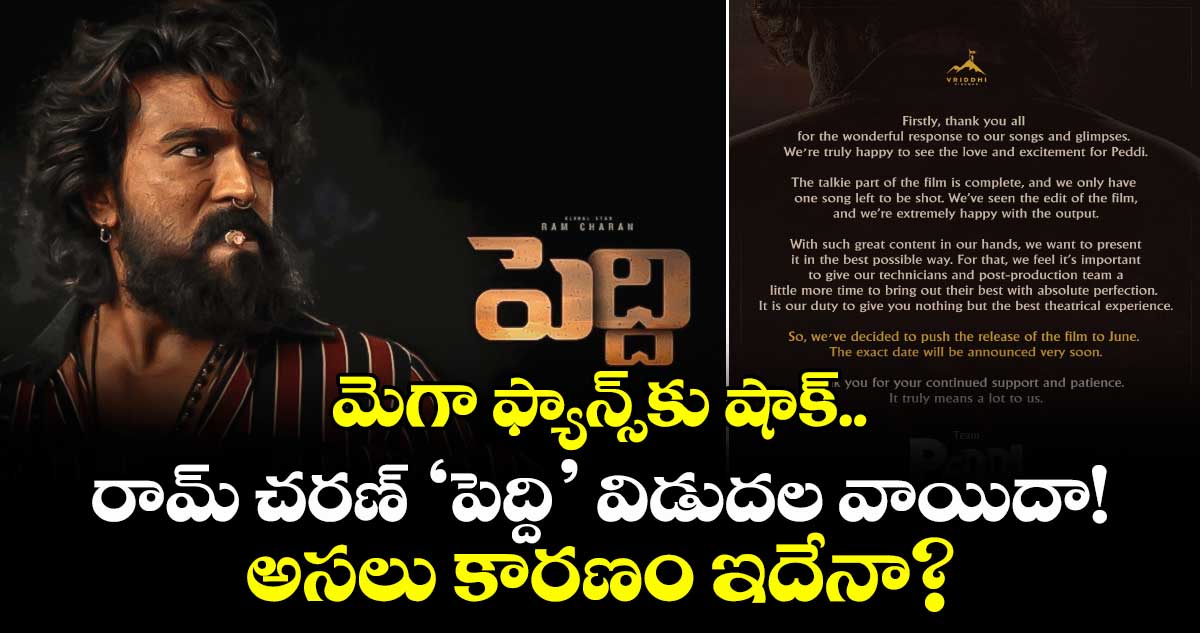 గ్లోబల్ స్టార్ రామ్ చరణ్, దర్శకుడు బుచ్చిబాబు సానా కాంబినేషన్ లో వస్తున్న క్రేజీ ప్రాజెక్ట్ ‘పెద్ది’ . క్రీడలు, గ్రామీణ నేపథ్యంలో సాగే మాస్ ఎంటర్టైనర్గాఈ చిత్రాన్ని తెరకెక్కిస్తున్నారు. ఇప్పటికే రిలీజ్ చేసిన సాంగ్స్ తో ఈ మూవీపై అంచనాలు రెట్టింపు చేశాయి. ఈ సినిమా కోసం అయితే ఎంతో ఆత్రుతలో ఎదురుచూస్తున్న అభిమానులకు మేకర్స్ షాక్ ఇచ్చారు. మరో సారి ఈ చిత్రం రిలీజ్ వాయిదా పడింది. నిజానికి ఈ సినిమా ఏప్రిల్ 30, 2026న విడుదల కావాల్సి ఉంది. అయితే షూటింగ్ , పోస్ట్ ప్రొడక్షన్ పనుల కారణంగా విడుదలను వాయిదా వేస్తున్నట్లు అధికారికంగా ప్రకటించారు.