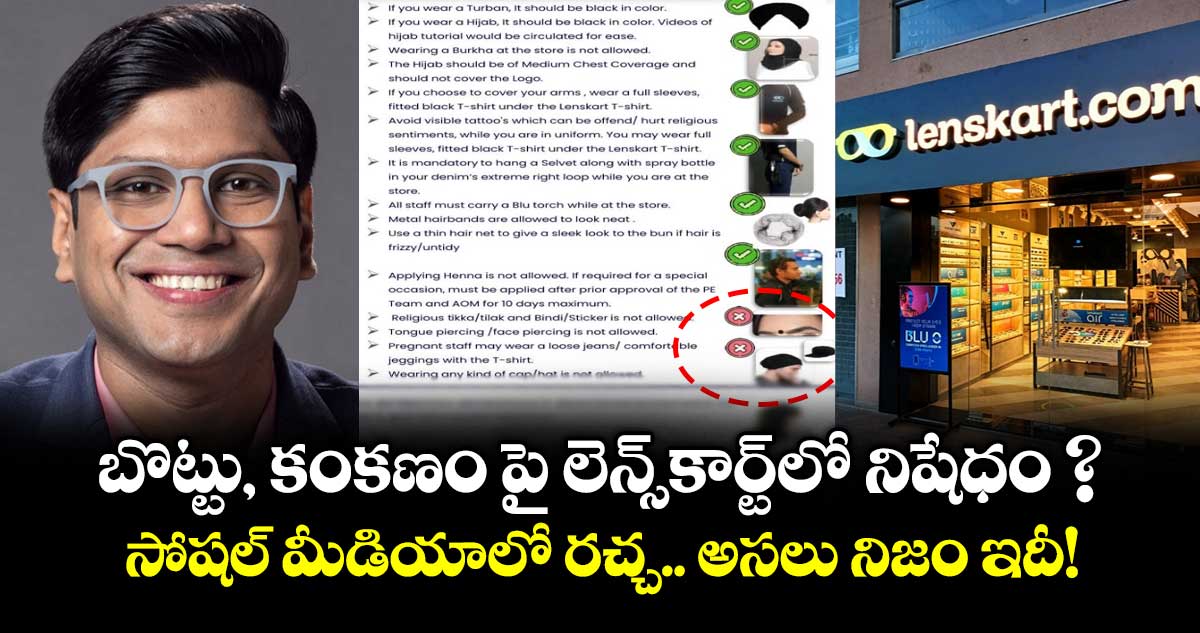ప్రముఖ ఐవేర్ సంస్థ లెన్స్కార్ట్ (Lenskart) చుట్టూ సోషల్ మీడియాలో ఓ పెద్ద వివాదం చెలరేగింది. కంపెనీ ఉద్యోగులను బొట్టు, తిలకం ధరించకూడదని నిబంధన పెట్టిందనే వార్త వైరల్ కావడమే దీనికి కారణం. దీనికంటే ముందు సోషల్ మీడియాలో లెన్స్కార్ట్ కంపెనీకి చెందిన ఒక పాత నిబంధన బయటకు వచ్చింది. అందులో ఉద్యోగులు హిజాబ్ ధరించవచ్చని, కానీ బొట్టు, తిలకం లేదా చేతికి కంకణాలు కట్టుకోకూడదని ఉన్నట్లు చూపిస్తుంది. ప్రముఖ రచయిత్రి షెఫాలీ వైద్య దీనిపై స్పందిస్తూ, భారతదేశంలో ఉంటూ హిందూ సంప్రదాయాలను నిషేధించడం ఏంటి ? అని ప్రశ్నించారు.