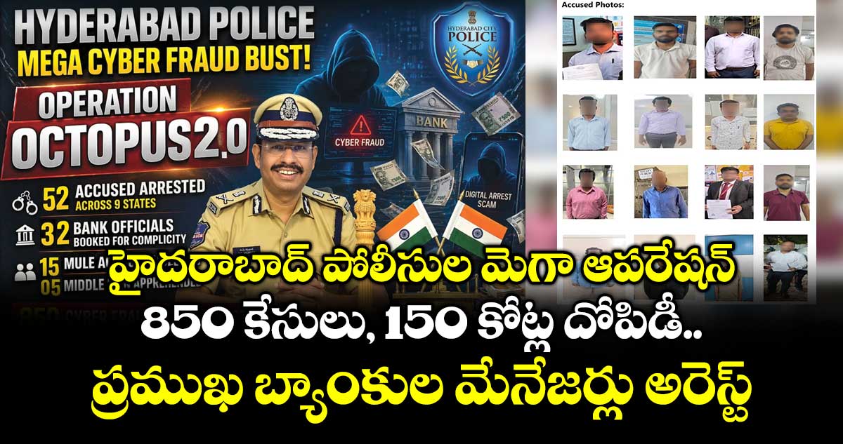 దేశవ్యాప్తంగా సాగుతున్న భారీ సైబర్ మోసాల నెట్వర్క్ను హైదరాబాద్ పోలీసులు ఛేదించారు. ‘ఆపరేషన్ ఆక్టోపస్-2.O’ పేరుతో నిర్వహించిన ఈ భారీ ఆపరేషన్లో మొత్తం 9 రాష్ట్రాల్లో సోదాలు నిర్వహించి, బ్యాంకు అధికారులు సహా 52 మంది నిందితులను అరెస్టు చేశారు. పెట్టుబడి స్కామ్లు, ట్రేడింగ్ మోసాలు, డిజిటల్ అరెస్ట్ పేరుతో అమాయకులను బెదిరించి భారీగా సొమ్ము దోచుకుంటున్న ముఠాలకు అండగా నిలుస్తున్న బ్యాంకు అధికారులే లక్ష్యంగా ఈ ఆపరేషన్ జరిగింది