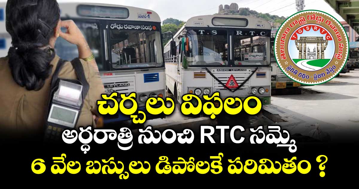 ప్రభుత్వానికి తమ సమస్యలను వివరించామని, తమ డిమాండ్లు అన్నీ పాత డిమాండ్లేనని చెప్పారు. ఐఏఎస్ అధికారుల కమిటీ వేసి చర్చలు అనడం కరెక్ట్ కాదని TGSRTC జేఏసీ అసంతృప్తి వ్యక్తం చేసింది. కార్మిక జేఏసీ తమ డిమాండ్లను పూర్తిగా పరిగణనలోకి తీసుకోలేదని, చర్చల పేరుతో ప్రభుత్వం కాలయాపన చేసిందని ఆర్టీసీ జేఏసీ నాయకులు మండిపడ్డారు. అర్థరాత్రి నుంచి సమ్మె కొనసాగుతుందని, ఎవ్వరి ఒత్తిళ్లకు తాము లొంగమని RTC JAC నాయకులు స్పష్టం చేశారు. TGSRTC ఉద్యోగ సంఘాలు అర్ధరాత్రి నుంచి సమ్మెకు పిలుపునివ్వడంతో తెలంగాణలో బస్సులు డిపోలకే పరిమితం అయ్యే అవకాశం ఉంది.