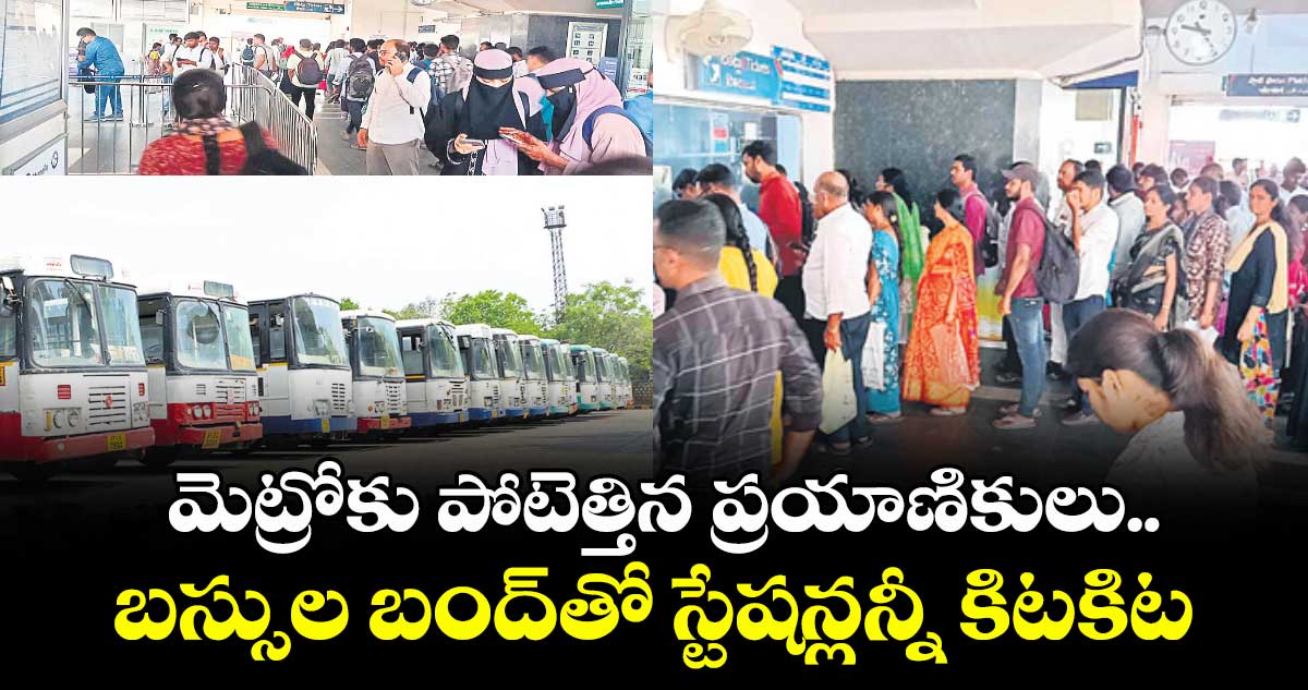 హైదరాబాద్, వెలుగు: ఆర్టీసీ కార్మికుల సమ్మెతో బుధవారం హైదరాబాద్ మెట్రో రైళ్లలో ప్రయాణికుల రద్దీ నెలకొంది. బస్సులు రోడ్డెక్కకపోవడం, ఆటోలు, క్యాబ్ ల యజమానులు చార్జీలు ఇష్టారాజ్యంగా పెంచేయడంతో సామాన్యులు, ఐటీ ఉద్యోగులు మెట్రో స్టేషన్లకు క్యూ కట్టారు. వేసవి సెలవులు, పెళ్లిళ్ల సీజన్ కావడంతో స్టేషన్లన్నీ ప్రయాణికులతో కిక్కిరిసిపోయి కనిపించాయి.