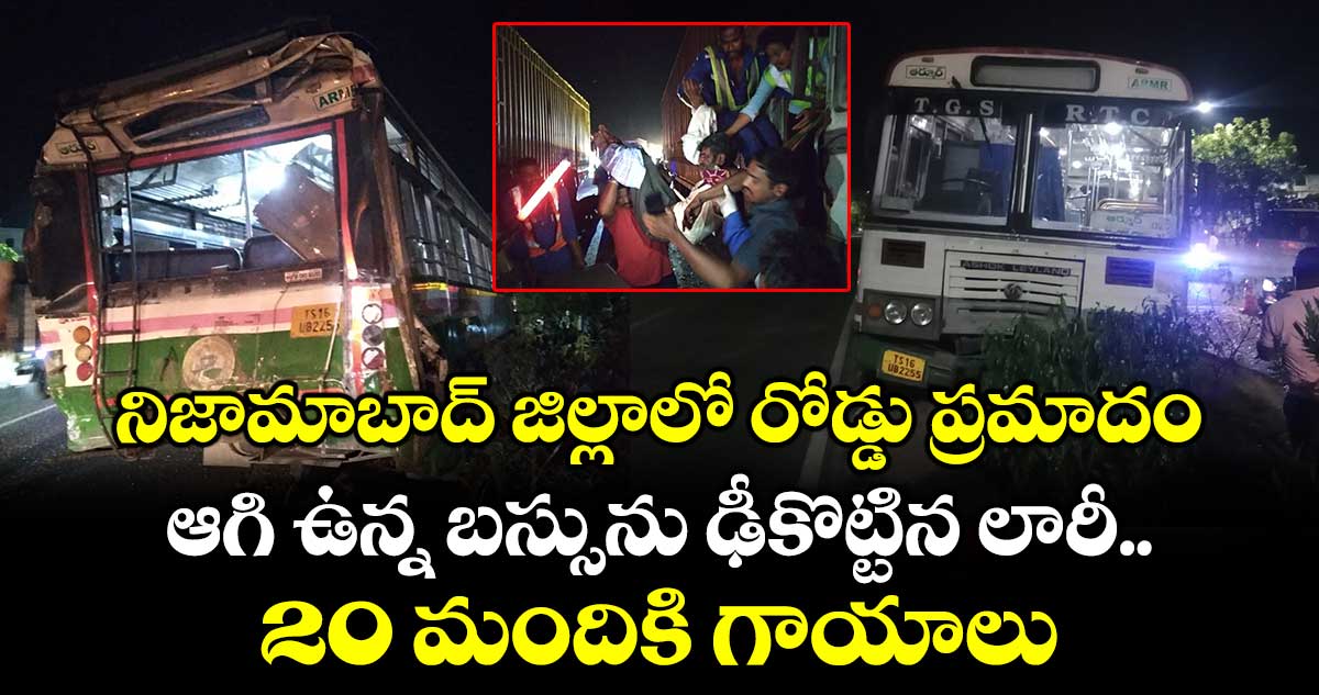 నిజామాబాద్ జిల్లాలో ఘోర రోడ్డు ప్రమాదం జరిగింది. ఆగి ఉన్న బస్సును లారీ ఢీ కొట్టింది. 2026 ఏప్రిల్ 24న రాత్రి జరిగిన ఈ ప్రమాదంలో 20 మందికి తీవ్ర గాయాలయ్యాయి. జక్రాన్ పల్లి మండలం ఆర్గుల్ 44 నేషనల్ హైవేపై ఈ ప్రమాదం చోటు చేసుకుంది.