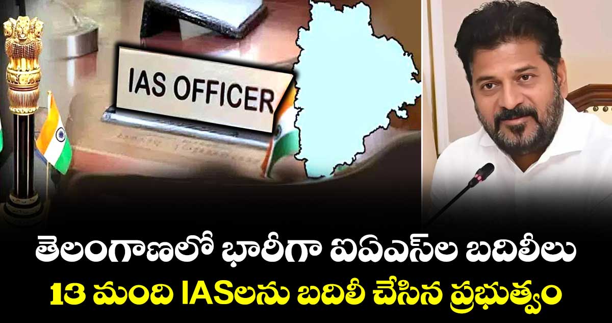 హైదరాబాద్: తెలంగాణ ప్రభుత్వం భారీగా ఐఏఎస్లను బదిలీ చేసింది. 13 మంది ఐఏఎస్లను బదిలీ చేస్తూ తెలంగాణ ప్రభుత్వం శనివారం ఉత్తర్వులు జారీ చేసింది. పరిశ్రమల శాఖ స్పెషల్ సెక్రటరీగా కృష్ణ ఆదిత్య, ఆరోగ్యశ్రీ హెల్త్ కేర్ ట్రస్ట్ సీఈవోగా హనుమంతు, ఆర్అండ్బీ స్పెషల్ సెక్రటరీగా ప్రవీణ్య, ట్రైబల్ వెల్ఫేర్ స్పెషల్ సెక్రటరీగా సంతోష్, ఇంటర్ బోర్డ్ సెక్రటరీగా అభిలాష్ అభినవ్, పంచాయతీ రాజ్ స్పెషల్ సీఎస్గా దాన కిషోర్, సాంఘిక సంక్షేమ శాఖ సెక్రటరీగా విజయేంద్ర, ఢిల్లీ తెలంగాణ భవన్ స్పెషల్ ఆఫీసర్గా సంజయ్ కుమార్లను బదిలీ చేస్తూ ప్రభుత్వం ఉత్తర్వులు జారీ చేసింది.