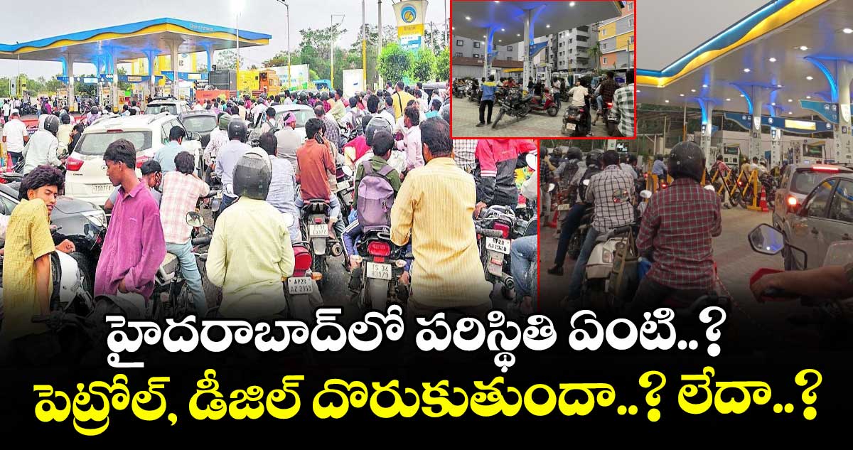 హైదరాబాద్లోని బంకుల వద్ద భారీ క్యూ లైన్లు కనిపిస్తున్నాయి. కొన్ని చోట్ల 2 లీటర్లే పోస్తామంటూ బోర్డులు పెట్టారు. అధిక కొనుగోళ్లతో జిల్లాల్లోనూ పరిస్థితి ఆగమాగంగా ఉంది. బైక్లకు రూ.500, కార్లకు 2వేల చొప్పున పెట్రోల్ బంకులు కోటా పెడుతున్న పరిస్థితి ఉంది. ఇది తాత్కాలిక ఒత్తిడేనని, ఇంధన కొరత లేదని అధికారులు, ప్రభుత్వం చెబుతుంది. ఇంధనాన్ని దాచి పెట్టి కృత్రిమ కొరత సృష్టించినా, తప్పుడు వదంతులు ప్రచారం చేస్తే చర్యలు తీసుకుంటామని అధికారులు హెచ్చరిస్తున్నారు.